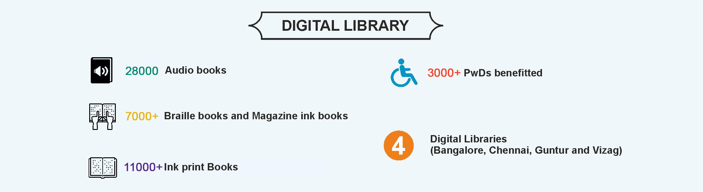 There are six Digital Book Libraries established by the Samarthanam Trust for the Diasbales in more than five Indian cities.
