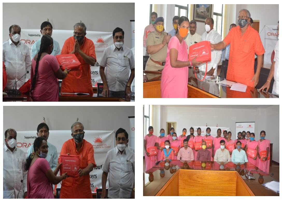 Distribution of health and hygiene kits to ASHA workers today at Chamarajanagar, is an initiative of SamarthanamTrust for the Disabled supported by Oracle under its CSR programme.