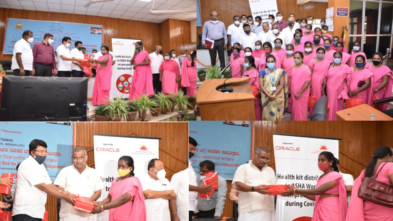 Distribution of health and hygiene kits to 2143 ASHA workers across Karnataka is an initiative of Samarthanam Trust for the Disabled supported by Oracle under its CSR programme. 29th March saw Health kits distribution at Zilla Panchayat Office, Tumkur.
