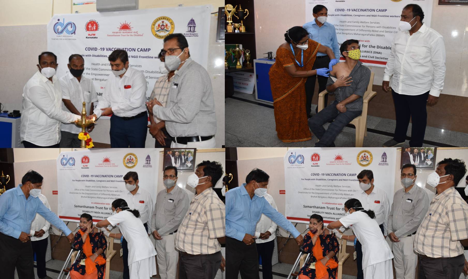 Health and Family Welfare Services, Office of the State Commissioner for Persons with Disabilities, Directorate for the Empowerment of Differently Abled and Senior Citizens Bruhat Bengaluru Mahanagara Palike (BBMP), in collaboration with Samarthanam Trust for the Disabled, DISABILITY NGOs ALLIANCE (DNA) Voluntary Organisations and Civil Societies organized COVID-19 VACCINATION CAMP, For People with Disabilities, Caregivers, and NGO Frontline workers on 26th May 2021 in Samarthanam Trust for the Disabled, HSR Layout and Samarthanm Bhavan in J.P Nagar.
